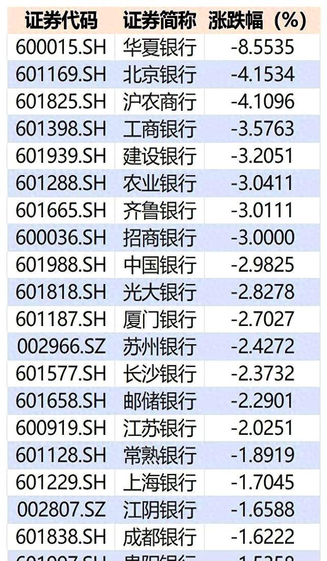 华夏银行更是领跌,直接来了个8.55%的“大跳水”,六大国有银行也跟着往下滑,这画面,简直比我过年回家抢火车票还刺激。
